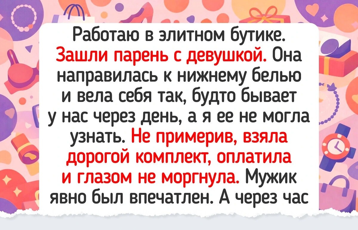 Работаю в элитном бутике. Зашли девушка с мужчиной. Она сразу направилась к нижнему белью и вела себя так, будто бывает у нас через день, а я ее впервые видела. Без примерки взяла самый дорогой комплект, оплатила и глазом не моргнула. Мужик явно был впечатлен. А через час она вернулась. Уже одна. Смущенно улыбнулась и тихо попросила оформить возврат. Пока я все оформляла, призналась: в торговом центре случайно встретила бывшего и захотела произвести впечатление. Показать, что у нее все отлично — и она может вот так, не задумываясь, покупать дорогие вещи. © ADME