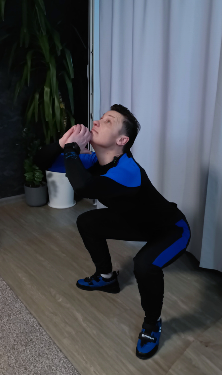 Когда взрослый приседает с узкой постановкой ног, носки прямо, пятки отрывает или даже подкладывает блин под пятки. Тазобедренные суставы не могут раскрыться, нагрузка идёт на колени. Мышцы тазового дна не включаются в работу, что ведёт к их слабости (проблемы с недержанием, геморрой, застой в малом тазу). Поясница берёт на себя избыточную нагрузку (гиперлордоз, походка «уточкой»), возникает риск грыж и протрузий. Стопы теряют стабильность, нагрузка смещается на носки, перегружая колени, или внешний край, исключая сильные мышцы.