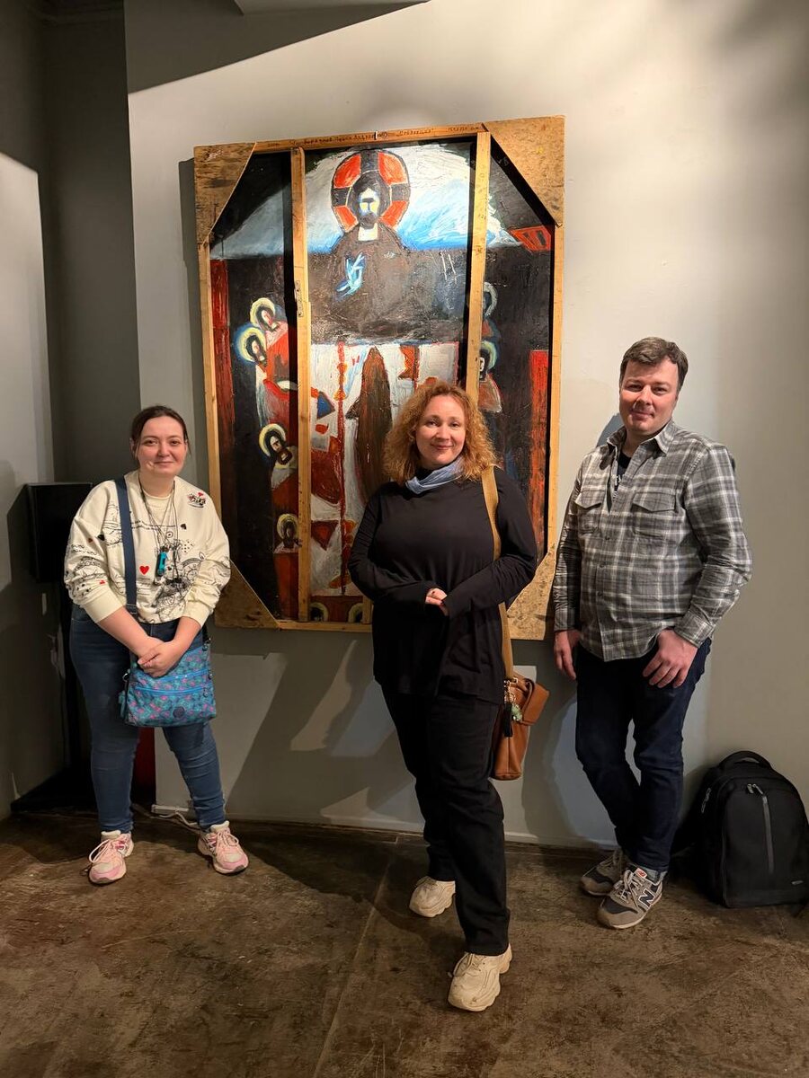 Выставка «Другая икона» - это коллекция работ на религиозную тему разных художников. Авторы не приследовали цели быть полностью каноничными, они размышляли. В этой связи среди зрителей периодически возникал вопрос: а можно ли так? Батюшка, взявший слово на открытии, предупредил, что выступает не от лица Церкви, а от лица простого человека и художника. «Если ты видишь икону и у тебя возникает с ней связь, ты начинаешь молиться, то можно» . На выставке есть живопись, графика и скульптура. Среди авторов есть настоящие специалисты иконописи и просто художники. А еще две картины прекрасного художника Павла Боркунова. У одной, «Тайное вечеря», мы сфотографировались (фото 1) - Инга Страхова, картина 🖼️, я и автор - Павел Боркунов. С нами была еще художница Татьяна Динер - ее я сфотографировала со спины на пути к одной из работ. Получилось очень атмосферно. Павел рассказал нам историю работы над своей картиной. Она очень непростая. Начиная с того, что картине 18 лет, художник ее отрезал,