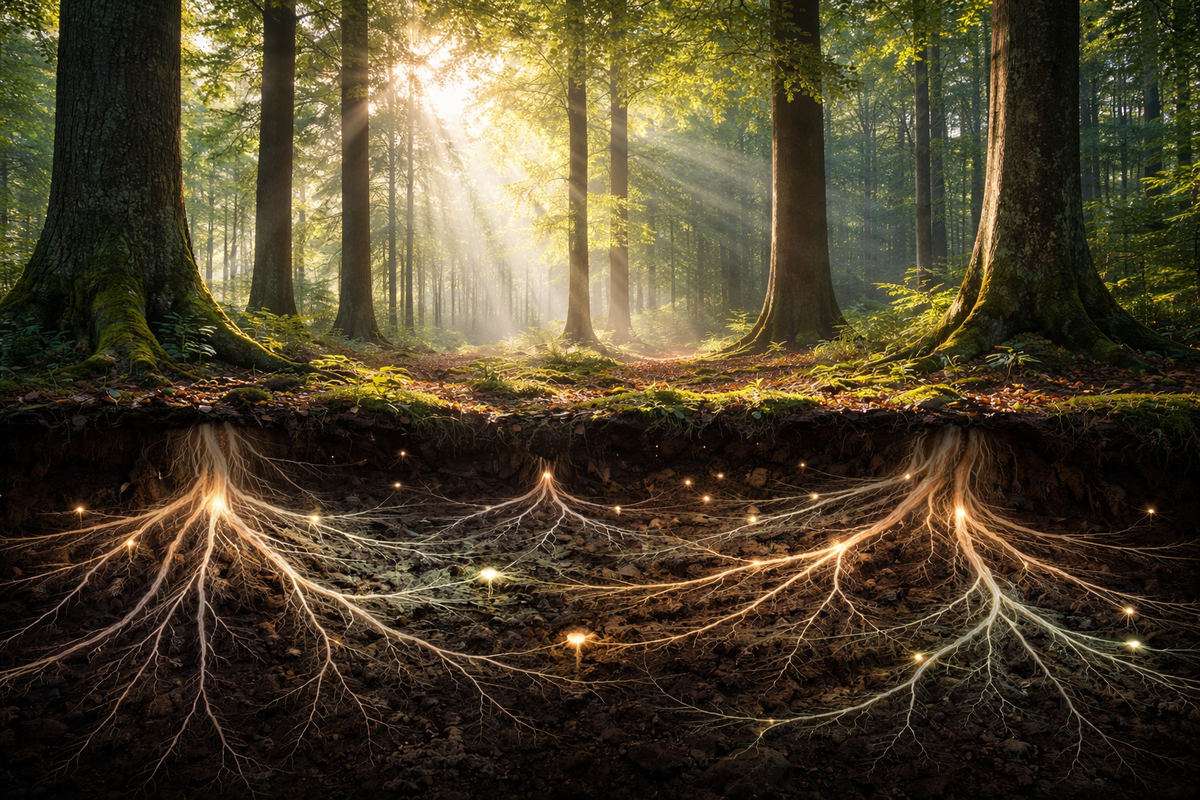 В лесу постоянно происходит обмен сигналами - просто он устроен иначе, чем у людей. Если представить лес как город, то под поверхностью земли происходит что-то вроде скрытой инфраструктуры - сеть, по которой передается информация и ресурсы. Главную роль здесь играют микоризные грибы. Они соединяют корни разных деревьев тонкими нитями, образуя сложную систему. Это похоже на ситуацию в офисе, где сотрудники связаны общей сетью: можно передать файл, сообщение или помочь коллеге. Так и в лесу - через грибницу дерево может «делиться» питательными веществами или сигналами. Например, более взрослые деревья иногда передают углерод молодым саженцам, особенно если тем не хватает света. Это не выглядит как осознанная помощь в человеческом смысле, но в целом система работает так, что повышает устойчивость всего сообщества. Помимо подземной связи, деревья используют и воздушные каналы. Когда на дерево нападают насекомые, оно может выделять в воздух определенные химические вещества. Эти сигналы улав
