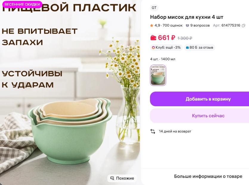 В комплект входят четыре миски разного объёма, благодаря чему легко подобрать подходящий вариант для любой задачи: от смешивания ингредиентов до замешивания теста.
