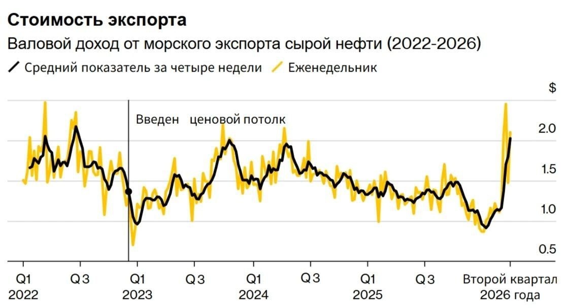 Война на Ближнем Востоке подняла мировые цены на нефть до многолетних максимумов и усилила спрос на российскую нефть, так как Ормузский пролив практически закрыт для судоходства. Это позволило задержать более 12 миллионов баррелей экспорта сырой нефти с Ближнего Востока в день в Персидском заливе и способствовать осушению российских объёмов, хранящихся в море, пока нефтеперерабатывающие заводы ищут альтернативные поставки. Всего 28 танкеров загрузили 20,88 миллиона баррелей российской нефти за неделю до 5 апреля. Объём был заметным восстановлением по сравнению с 16,62 миллиона баррелей на 22 судах на предыдущей неделе. Рост был вызван восстановлением поставок из Приморска, которые были нарушены на предыдущей неделе несколькими ударами украинских БПЛА. Порт Новороссийск частично возобновил отгрузку нефти и мазута на терминале Шесхарис — крупнейшем нефтеналивном терминале на юге России. Терминал Шесхарис приостанавливал погрузку нефти 6 апреля также после атаки дронов Украины. Таки