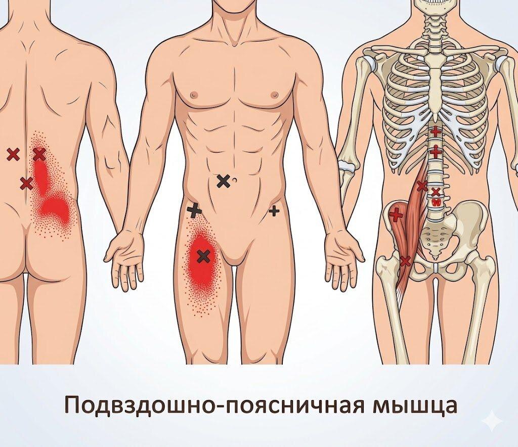 Подвздошно-поясничная мышца (назовём её ППМ, чтобы не ломать язык). Она начинается от позвонков, проходит через таз и цепляется за бедренную кость. Простыми словами: это верёвка, которая держит ваш поясничный отдел и таз.