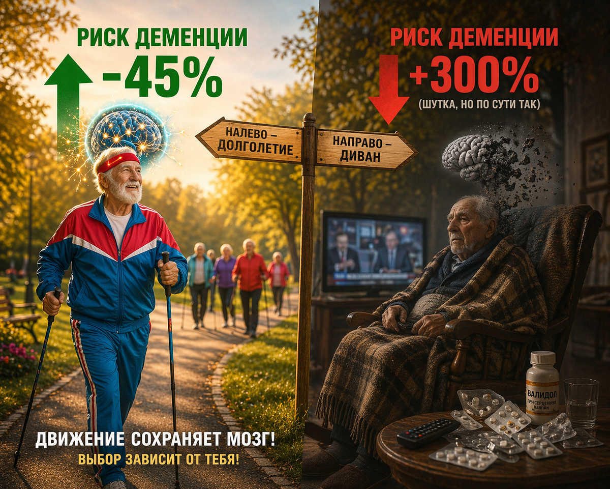 Вот это новость, от которой у современных 60-летних, только что вышедших на пенсию (и не знающих, чем себя занять), загораются глаза. А у ленивых 40-летних — опускаются руки. Согласно исследованию, опубликованному в авторитетном журнале JAMA Network Open, физическая активность в среднем (45–64 года) и пожилом возрасте (65–88 лет) снижает риск развития деменции на 36–45% по сравнению с теми, кто ведет малоподвижный образ жизни . Спойлер для тех, кто уже махнул на себя рукой: «Спорт в молодости — залог здоровья в старости» — это, оказывается, не совсем правда. Активность в ранней взрослости (26–44 года) на риск деменции спустя десятилетия никак не повлияла . То есть можно было всю молодость пробегать марафоны, а к 60 залечь на диван и… всё. А можно было всю жизнь лежать на диване, а в 65 встать и пойти — и догнать упущенное. Ученые из Бостонского университета взяли данные знаменитого Фрамингемского исследования (за которым наблюдают аж с 70-х годов прошлого века). Они разделили 4 354 уча