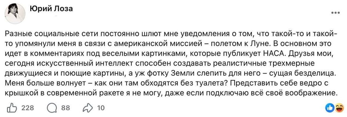 : «Друзья мои, сегодня искусственный интеллект способен создавать реалистичные трехмерные движущиеся и поющие картины, а уж фотку Земли слепить для него - сущая безделица. Меня больше волнует - как они там обходятся без туалета? Представить себе ведро с крышкой в современной ракете я не могу, даже если подключаю всё своё воображение.» Заря | Новости - Подписаться