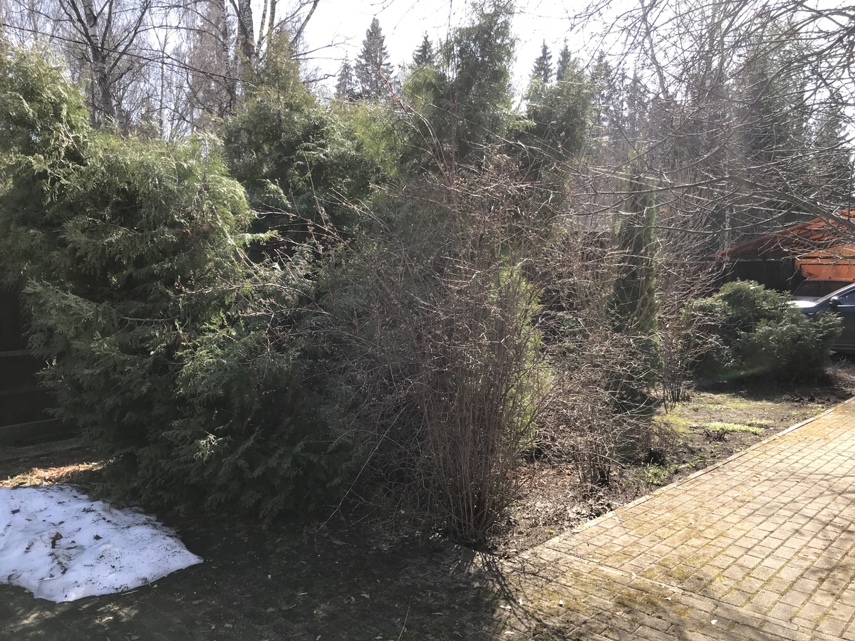 Сегодня я продолжу рассказ о саде, с которым я работала в прошлом сезоне. Вчера я разбирала старые фотографии и нашла фото того, с чего все начиналось. В каком первоначальном виде достался мне объект, множество рабочих моментов. Снят процесс того, как преображался, шаг за шагом, этот замечательный сад. Итак, приступим: вот, взгляните, это сильно разросшаяся старая туя вересковидная. Она каждую зиму заваливала свои ветви под тяжестью снега, ее мягкие и гибкие стволы были перетянуты веревками и проволокой, в попытках придать растению хоть какой-то приличный вид. Но даже при этом, она выглядела просто чудовищно. Огромный, больше четырех с половиной метров, разлапистый нечесаный зверь. Ситуацию усугубляли кусты чубушника, сирени, пузыреплодника и спиреи, окружающие нашу тую со всех сторон плотным и непроходимым кольцом. Владельцы участка даже задумывались об удалении этого растения, так-как совсем не представляли, что можно его как-то привести в чувство. Я начала с удаления всех верев