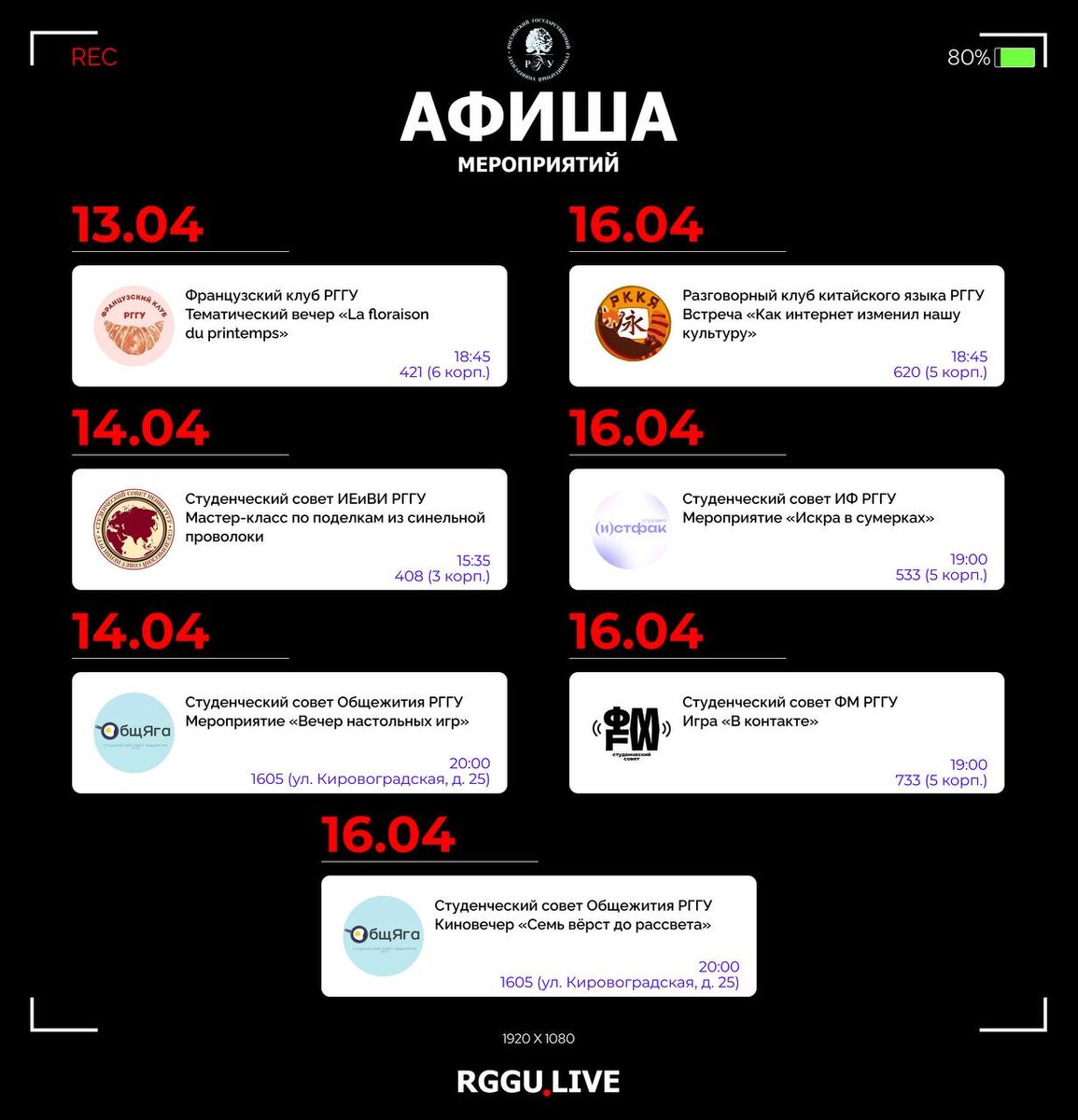 📢 Французский клуб РГГУ приглашает на тематический вечер «La floraison du printemps» 📌 13.04/ 18:45/ 421 (6 корп.) Подробнее здесь 👈 📢 Студенческий совет ИЕиВИ РГГУ организует мастер-класс по поделкам из синельной проволоки 📌 14.04/ 15:35/ 408 (3 корп.) Подробнее здесь 👈 📢 Студенческий совет Общежития РГГУ предлагает принять участие в мероприятии «Вечер настольных игр» 📌 14.04/ 20:00/ 1605 (ул. Кировоградская, д. 25) Подробнее здесь 👈 📢 Разговорный клуб китайского языка РГГУ устраивает встречу «Как интернет изменил нашу культуру» 📌 16.04/ 18:45/ 620 (5 корп.) Подробнее здесь 👈 📢 Студенческий совет исторического факультета РГГУ ждёт на мероприятии «Искра в сумерках» 📌 16.04/ 19:00/ 533 (5 корп.) Подробнее здесь 👈 📢 Студенческий совет ФМ РГГУ зовёт на игру «В контакте» 📌 16.04/ 19:00/ 733 (5 корп.) Подробнее здесь 👈 📢 Студенческий совет Общежития РГГУ проводит киновечер «Семь вёрст до рассвета» 📌 16.04/ 20:00/ 1605 (ул. Кировоградская, д. 25) Подробнее здесь 👈