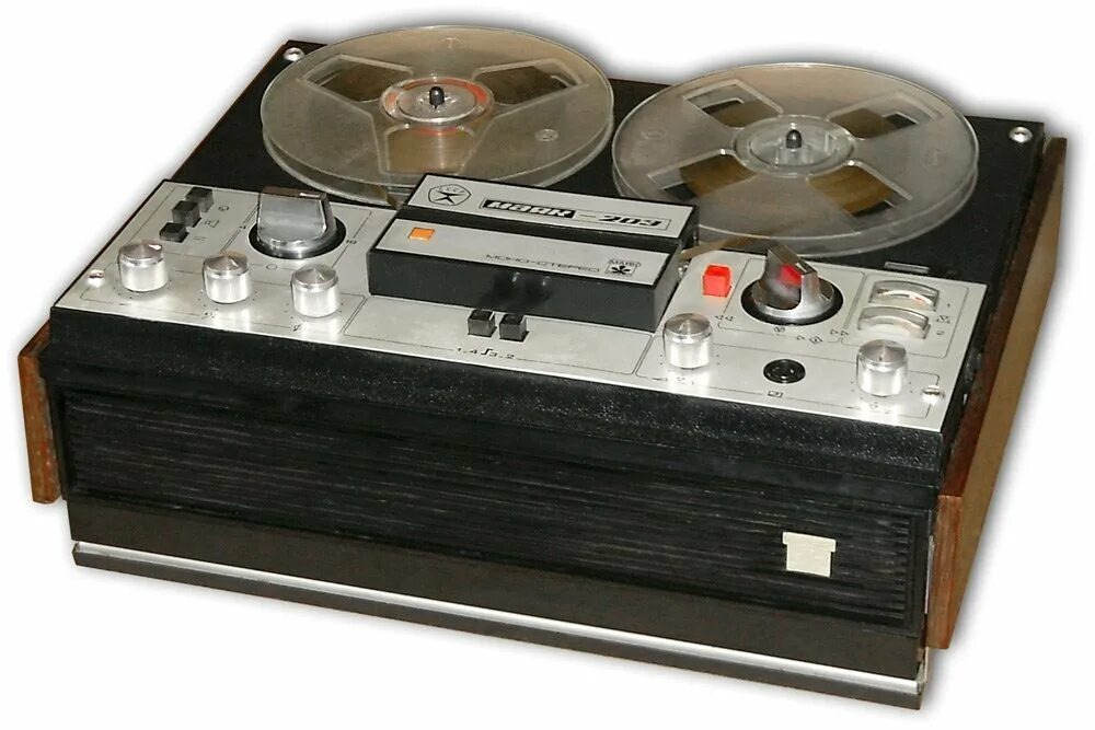 Представьте: большой ящик с двумя круглыми «тарелками» — это бобинный магнитофон. На них крутятся катушки с магнитной лентой.