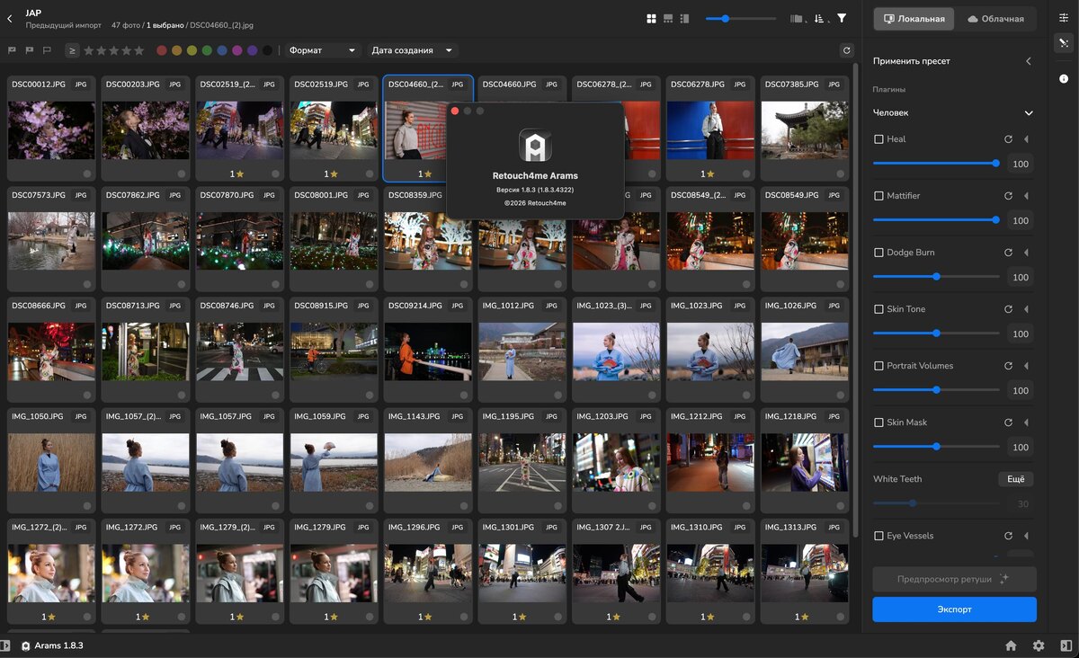 8.3. Это бесплатная оболочка для всех плагинов компании разом, позволяющая обрабатывать фото пакетно тысячами сразу несколькими плагинами с индивидуальными настройками. Более того, Arams позволяет быстро отбирать и каталогизировать фото с помощью мощного ИИ. При этом вы не тртаите кредиты - плагины покупаются раз и навсегда без ограничений по обработкам. В версии 1.8.3 - вам доступно больше контроля, то есть теперь вы управляете процессами отбора ретуши, а не наоборот. Что нового? Исправление багов Повышение производительности Новый UI группировки фотографий Добавлены обучающие ролики в интерфейс Добавлены горячие клавиши для выделения от текущей фотографии до первой/последней Добавлена возможность проверить соединение с серверами и выбрать подходящий в случай, если РКН случайно заблокирует ещё какие то IP адреса для Россиян. Arams — это идеальное решение для автоматической ретуши неограниченного количества фотографий с помощью AI-плагинов Retouch4me. Скачать программ