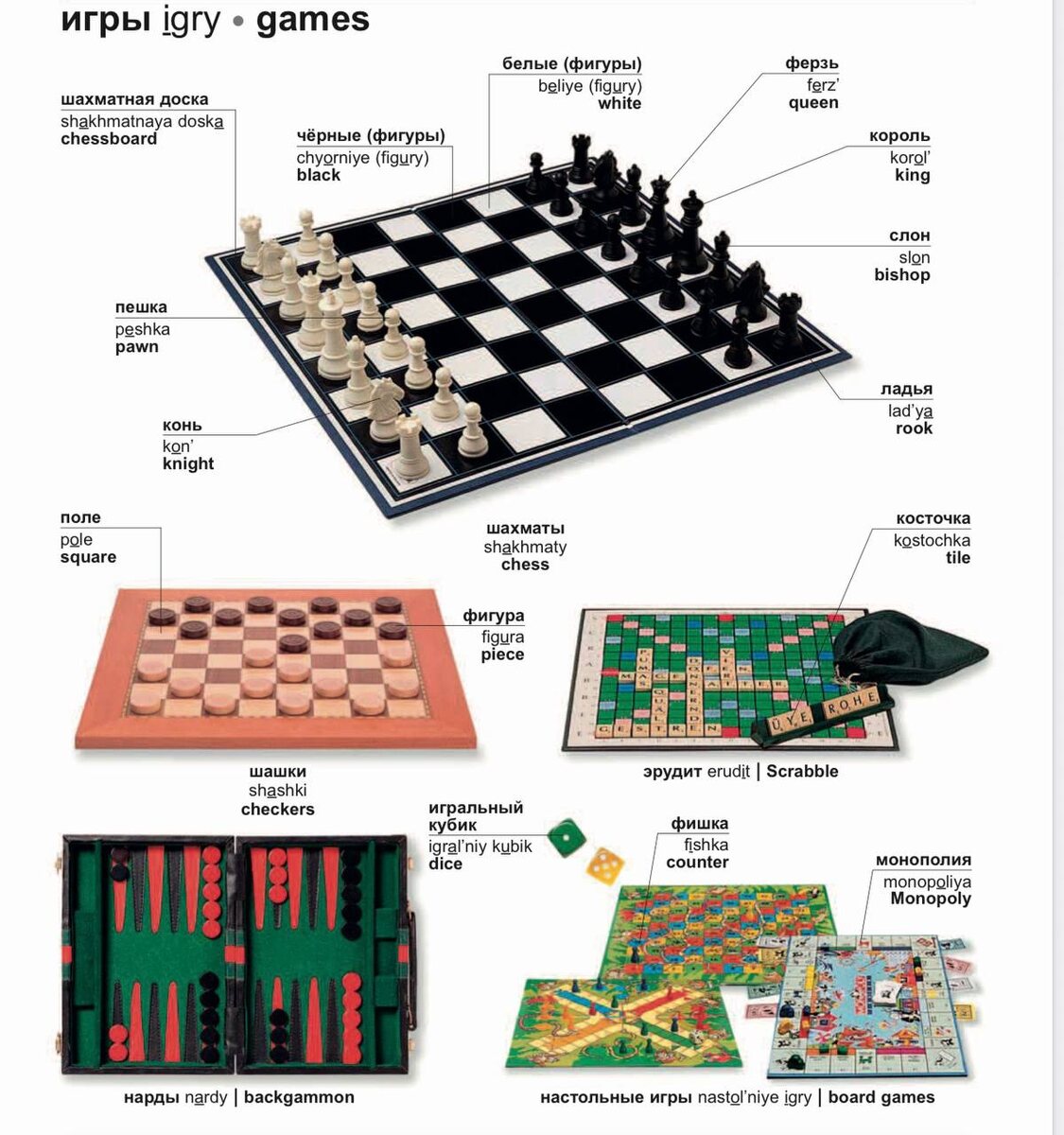 🔖 подумала, что надо и вам проверить себя: карты - playing cards дама - queen туз - ace буби - diamonds шашки - checkers (в США) / draughts (в Британии) шахматы - chess ферзь - queen слон - bishop нарды - backgammon кубик - dice сколько знали? → у нас на курсах есть целый блок на такую тему и на все темы с которыми я хоть раз сталкивалась в жизни: медицина, настолки, социальные сети, тру крайм, спорт etc, пробуйте 🥹 ⚡️ Сам с нуля до С1: интерактивные курсы на нашей платформе для всех уровней 📲 Разговорный английский бесплатный урок: +1 уровень за 4 месяца, гарантировано