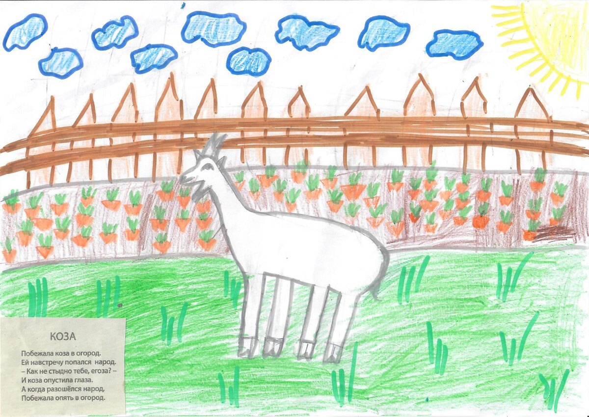 Описание: "На своём рисунке я изобразил вредную, непослушную козу, которая бегала в огород, хотя её туда никто не звал. Люди пытались устыдить козу, она притворилась, что ей стыдно ("опустила глаза"), но как только люди разошлись, опять пошла в огород". Стихотворение Николая Рубцова "Коза" написано в шутливой форме и посвящено теме " О животных" и отражает отношение поэта к животным".