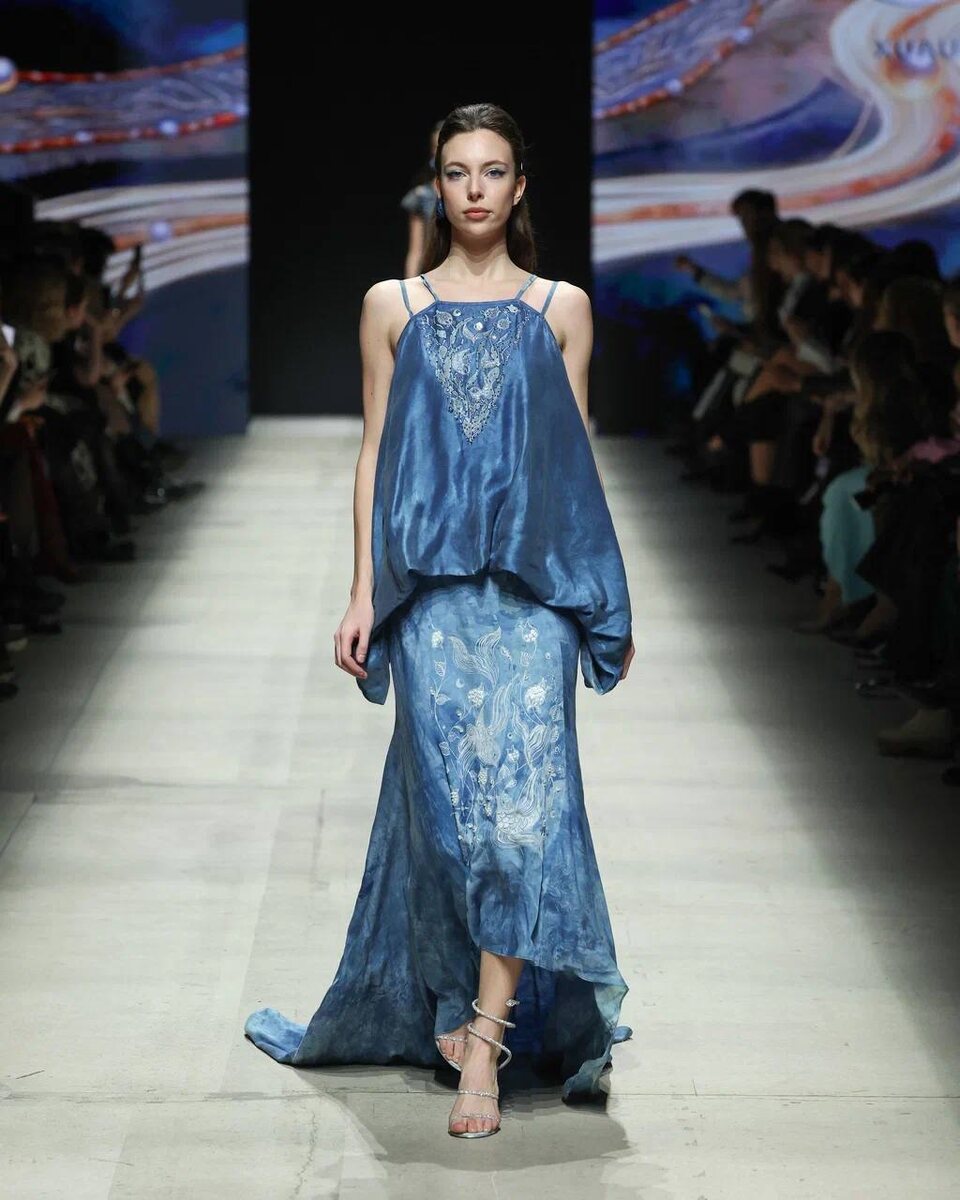 В основе коллекции — асимметричная драпировка, многослойность и струящиеся силуэты, передающие образы природы, а знаковый цвет — синий — раскрывается в градиенте от светлого индиго до глубоких вечерних оттенков. Образы сочетают ручную работу и современные материалы, формируя баланс между этническим наследием и актуальной модой. Канал Московской недели моды теперь можно найти в MAX. Подписывайтесь!