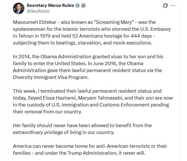 Rubio revokes 'lawful permanent resident status' for family of Iran hostage crisis figure