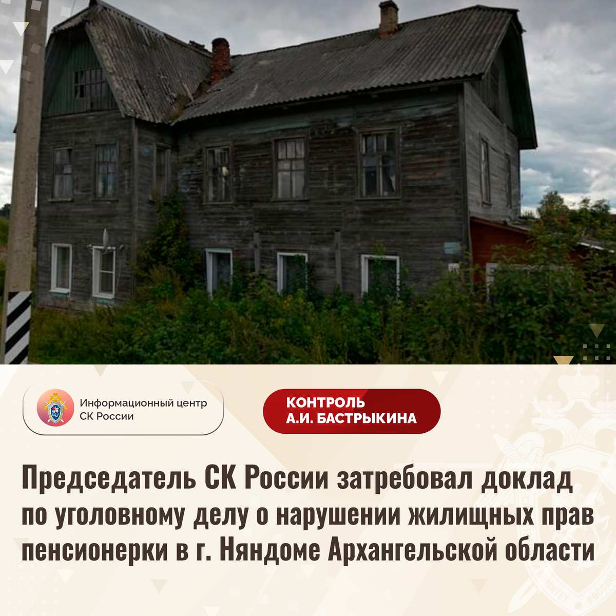 Председатель СК России затребовал доклад по уголовному делу о нарушении жилищных прав пенсионерки в г. Няндоме Архангельской области К Председателю СК России А.И. Бастрыкину через Информационный центр обратилась жительница Архангельской области по вопросу нарушения жилищных прав ее 79-летней матери. Пожилая женщина является единственным жильцом многоквартирного дома 1936 года постройки на улице Первомайской города Няндома. В 2021 году строение из-за высокой степени износа признано аварийным, однако до настоящего времени мер к предоставлению пенсионерке благоустроенного жилья не принимается, срок расселения не сообщается. Многочисленные обращения в компетентные органы результатов не принесли. В СУ СК России по Архангельской области и Ненецкому автономному округу возбуждено уголовное дело. Председатель Следственного комитета Российской Федерации Александр Иванович Бастрыкин затребовал у руководителя СУ СК России по Архангельской области и Ненецкому автономному округу Алексея Валерьевича