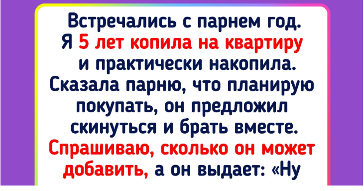 Встречались с парнем год. Я последние 5 лет копила на квартиру и практически накопила. Сказала ему, что планирую покупать квартиру, он предложил добавить и купить совместно. Спросила, сколько он может добавить, а тот выдал: «Ну у меня 153 тысячи есть». Я чуть не упала! Решила, что займу у коллеги и сама куплю. Так и сделала. После этого парень мне мозг вынес, мол, я замуж хотел тебя позвать, а ты так некрасиво поступила. При этом не забывает всем рассказывать, что мы купили квартиру. Мы будем переезжать скоро. А я вообще не понимаю, откуда взялись эти «мы». Смешной.