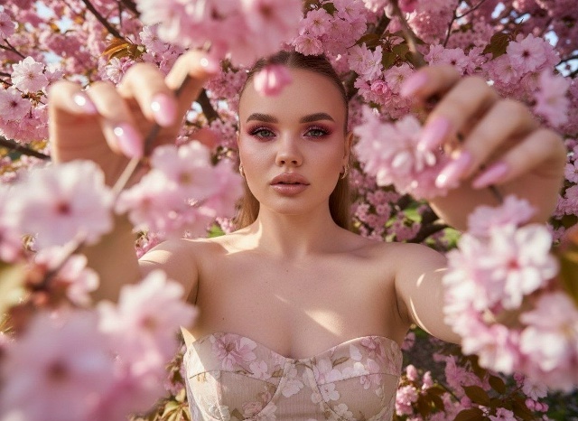 A cinematic spring portrait photograph captured through dense pink blossom branches, creating a strong foreground–background depth composition. The image is taken with a 50mm portrait lens, producing shallow depth of field so the blossoms and hands close to the camera appear soft and large, while the subject stands further back inside the flowering tree. The foreground dominates the frame: large pink blossoms and branches surround the lens, and two hands reach forward through the flowers closest to the camera, appearing slightly blurred due to proximity and depth of field. Long glossy pink gel nails are clearly visible on these hands, which gently part the blossoms. The foreground flowers and hands form a natural frame. The subject stands several steps behind the foreground branches, deeper inside the tree canopy. The subject appears smaller in the composition and partially surrounded by blossoms. This creates a layered effect: hands and flowers in the foreground, blossoms around the subject in the midground, and the subject further back. The subject looks through the flowers toward the camera with a confident yet calm expression. Main subject: person from img1. Preserve the identity and facial features of the person from img1 with high fidelity and photorealistic detail. Skin remains realistic and natural: visible pores on the cheeks and nose, subtle skin texture, minimal freckles, faint peach fuzz catching sunlight and natural highlights where the sunlight touches the cheekbones and nose. No smoothing or beauty filters. The subject wears a strapless dress in a soft neutral tone that subtly blends visually with the surrounding blossoms. The fabric has gentle floral textures and pale pink undertones so that parts of it appear to merge naturally with the flowers around the subject. Makeup is bold and eye-focused so the eyes remain visually strong even though the subject stands further back. The eyelids feature strong pink and rose-toned eyeshadow with shimmer highlights. Lashes appear long and defined. The lips have a high-shine glossy lip gloss reflecting light softly. The gel nails are long almond-shaped and painted glossy pink, matching the blossom tones. Lighting is natural spring daylight filtering through the branches, producing cinematic softness and warm highlights across the flowers, skin and nails while maintaining realistic color and texture. Negative prompt: beauty filter, airbrushed skin, plastic skin, overly smooth skin, unrealistic AI skin, CGI flowers, cartoon style, HDR overprocessing, distorted anatomy, extra limbs, incorrect depth perspective, watermark, text overlay.