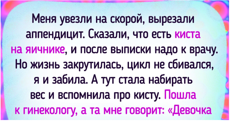 Меня увезли на скорой, вырезали аппендицит. Сказали, что есть киста на яичнике, и после выписки надо к врачу. Но жизнь закрутилась, цикл не сбивался, я и забила. А тут стала набирать вес и вспомнила про кисту. Пошла к гинекологу, а та мне говорит: «Девочка, да у тебя матка на нос смотрит!» Я такая: «В смысле?!» Оказалось, уже 21-я неделя. Цикл был обычный, токсикоза не было от слова совсем. Много переживала, как отразится моя операция под общим наркозом на плоде. Ну ничего, все обошлось в целом. Вот так, моей «кисте на правом яичнике» скоро 11 месяцев. © LDee2510