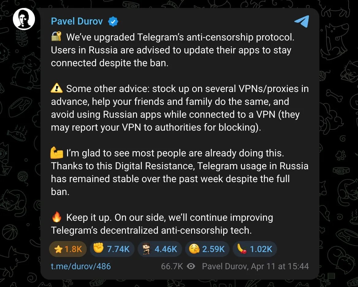 Павел Дуров объявил о масштабном обновлении MTProto: мессенджер усиливает защиту от блокировок и призывает пользователей обновить приложение