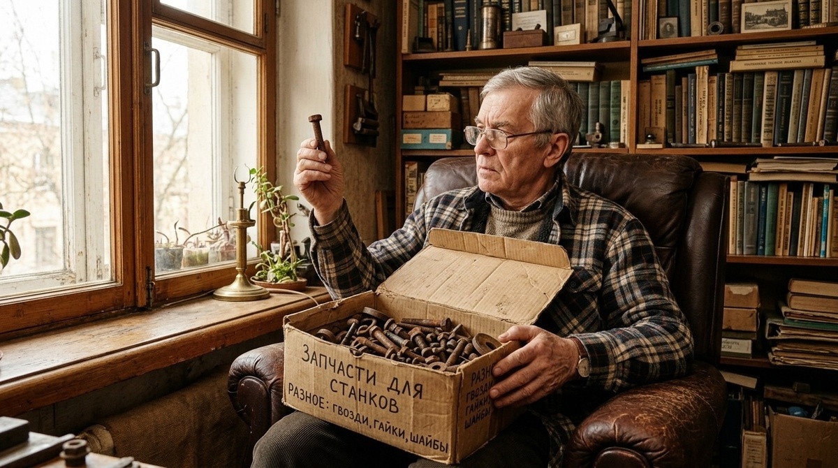 Он сидит в своём кресле и перебирает коробку с болтиками. Ржавые шайбы, какие-то гайки, обрезки проволоки. Этой коробке лет тридцать. Половину содержимого я не могу даже назвать. Но он перекладывает, сортирует, разглядывает каждую железку так, будто это коллекция бриллиантов.
