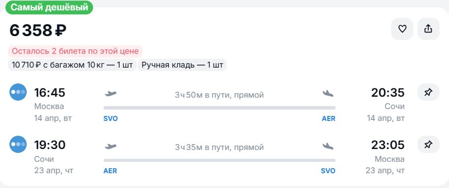 ! Поймали отличные варианты прямых рейсов в середине апреля. В стоимость включена ручная кладь: — С 13 по 21 апреля: 6 400 ₽ — С 13 по 22 апреля: 6 400 ₽ — С 14 по 23 апреля: 6 400 ₽ Успейте забронировать билеты, пока места не разобрали.