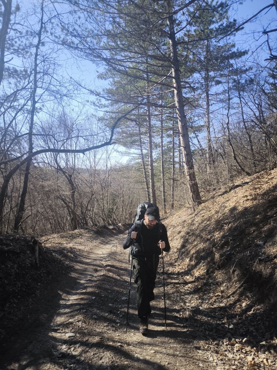 по палаткам. В ту ночь ни я, ни Вадим особо не спали, потому что было холодно. Четвертый день, собрались под моросящим дождем, выпили кофе и начали спускаться к Байдарским воротам. Тропа в тех местах идёт по лесу и очень скользкая в дождь. Колено уже второй день в ортезе и сильно недовольно. Через несколько километров у Байдарских ворот снялись с маршурта и поехали в Балаклаву. Суммарно прошли 2/3 от того, что планировали, но дальше идти был не вариант. Точнее можно было, но просто ещё одна бессонная ночь и уже точно болезнь. Факт +- доступен по ссылке тут, разбил по дням, позже доработаю по точкам и своим комментариям, опубликую отдельным постом - https://mapmagic.app/map?routes=VbRzyNV