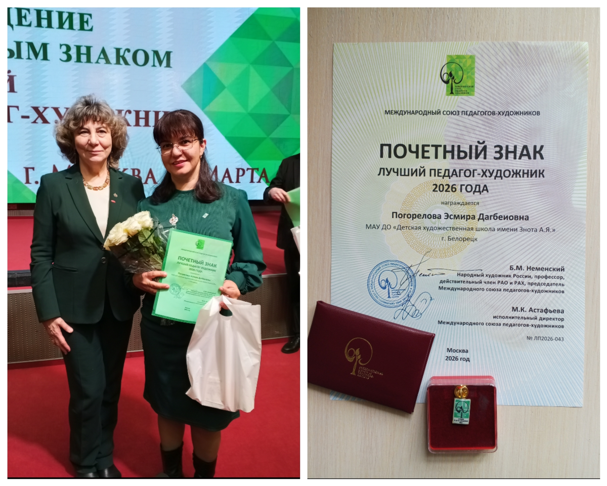 В Москве состоялись XIII Международный форум педагогов-художников и ежегодная научно-практическая конференция «Культурный код в контексте детского художественного творчества». В рамках этих мероприятий прошло вручение почётного знака «Лучший педагог-художник года». Среди награждённых - представители разных регионов России, в том числе Эсмира Погорелова - преподаватель белорецкой Детской художественной школы имени Артура Знота.