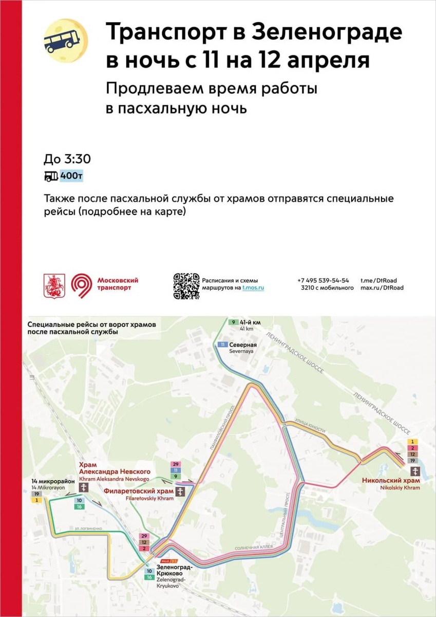 автобусов. От Никольского храма пустят автобусы маршрутов №1 и №19 до 14-го микрорайона и маршрутов №2 и №12 до станции Крюково. От Филаретовской церкви отправятся маршруты №9 до остановки «41-й километр», №11 и №29 до остановки «Северная». От храма Александра Невского близ 14-го микрорайона поедут автобусы №10 и №16. Кроме того, в эту ночь до 3:30 продлят время работы маршрута автобуса 400Т, связывающего Зеленоград со станцией метро «Тушинская». В Москве до 2:00 12 апреля будет открыт вход в метро и МЦК, также там продлят работу 150 маршрутов наземного транспорта. 🔵 Прислать новость Инфопортал Зеленограда в соцсетях ⬇️ 🔵 Telegram 📲 MAX 🌐 VK