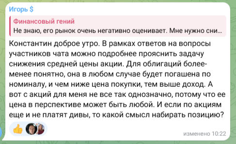 ...можно подробнее прояснить задачу снижения средней цены акции. Для облигаций более-менее понятно, она в любом случае будет погашена по номиналу, и чем ниже цена покупки, тем выше доход. А вот с акций для меня не все так однозначно, потому что ее цена в перспективе может быть любой. И если по акциям еще и не платят дивы, то какой смысл набирать позицию?