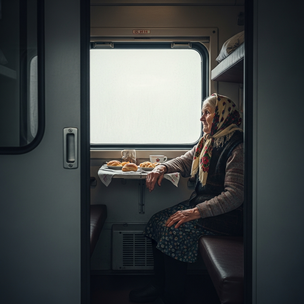 Нас подселяют в купе, где у окна, сидит маленькая, сухонькая старушка.