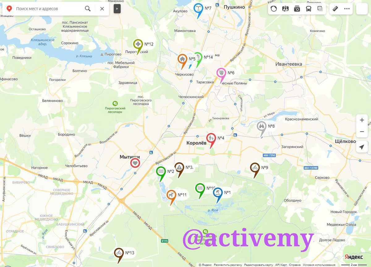 🗺 Карта со всеми точками здесь. 🎯 Название спота – активная ссылка на пост с описанием: 1⃣ Озеро Торфянка. <10 км. 2⃣ Чугунный мост. <5 км. 3⃣ Чайный домик. <5 км. 4⃣ Мемориал славы (у Троих). <10 км. 5⃣ Покровская церковь (Черкизово). <10 км. 6⃣ Усадьба Любимовка. <15 км. 7⃣ Родник Ивушка. <15 км. 8⃣ Дачный пос. Валентиновка. <15 км. 9⃣ Королёвские дёрты. <15 км. 🔟 Горелый мосток. <10 км. 1⃣1⃣ Лосиная биостанция. <10 км. 1⃣2⃣ Пос. Пироговский. <15 км. 1⃣3⃣ Дёрт Подкова. <10 км. 1⃣4⃣ Курганный могильник "Клязьма". <10 км. 1⃣5⃣ Потайной колодец. <10 км. 1⃣6⃣ Дача В. Маяковского. <15 км. 1⃣7⃣ Громовой ключ. <5 км. 1⃣8⃣ Мастерская С. Чибинеева. <15 км. 1⃣9⃣ Пруд Лось. <10 км. 2⃣0⃣ Белокаменная. 12-16 км. ✉️Прислать новость 📲Не грузит, есть MAX