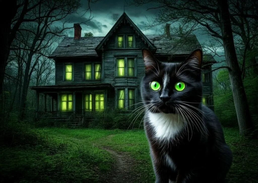 Чёрно-белая кошка Очень страшная история из жизни Читать 18+ Говорят, в каждом городе есть дом, о котором стараются не говорить вслух. В нашем — это старый особняк на краю леса. Его стены помнят крики, а окна смотрят в ночь, словно глаза, полные укора. Всё началось с появления странной кошки — чёрно-белой, с неестественно яркими зелёными глазами. С тех пор в доме поселился страх, а соседи стали исчезать один за другим. Эта история — не вымысел. Она произошла на самом деле. И если вы услышите ночью тихий шёпот или увидите в темноте два светящихся пятна — не оборачивайтесь. В посёлке N дом №13 по улице Лесной пользовался дурной славой. Его окна всегда были тёмными, а сад зарос бурьяном. Когда-то здесь жила семья Орловых: отец, мать и двое детей. Их гибель стала местной легендой — говорили, что отец сошёл с ума, убил жену и детей, а затем покончил с собой. После этого дом пустовал, но вскоре соседи стали замечать странную кошку — чёрно-белую, с неестественно яркими зелёными глазами. Она п