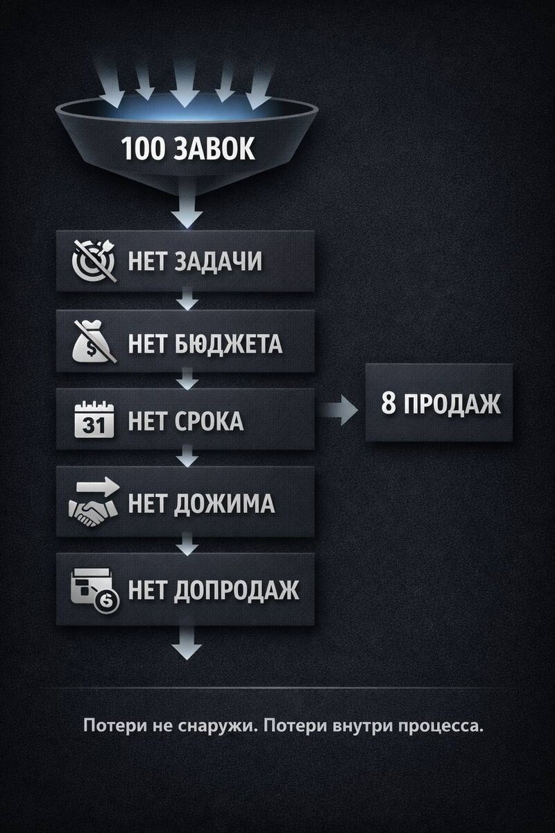 И даже не почти продажа Многие собственники смотрят на цифры так: Заявки идут. Отдел продаж работает. Но денег мало. И дальше начинается раздражение: реклама плохая, менеджеры слабые, рынок просел, клиенты странные. Но проблема часто в другом. У нас почему-то до сих пор любят считать заявку чем-то очень ценным. Хотя заявка - это просто человек, который оставил контакт. Не больше. Он мог: сравнивать 5 компаний, просто узнавать цену, собирать сметы, проверять рынок, не иметь денег, не быть готовым принимать решение сейчас. То есть заявка сама по себе ничего не гарантирует. Вот где начинается ошибка. Компания видит входящий поток и заранее мысленно записывает эти обращения в будущую выручку. А потом удивляется, что план не сходится. Чтобы из заявки получилась продажа, должно совпасть сразу несколько вещей: 1. У клиента должна быть реальная задача Не интерес ради интереса, а конкретная потребность 2. У клиента должны быть деньги Не потом, не когда-нибудь, не после сезона, а х