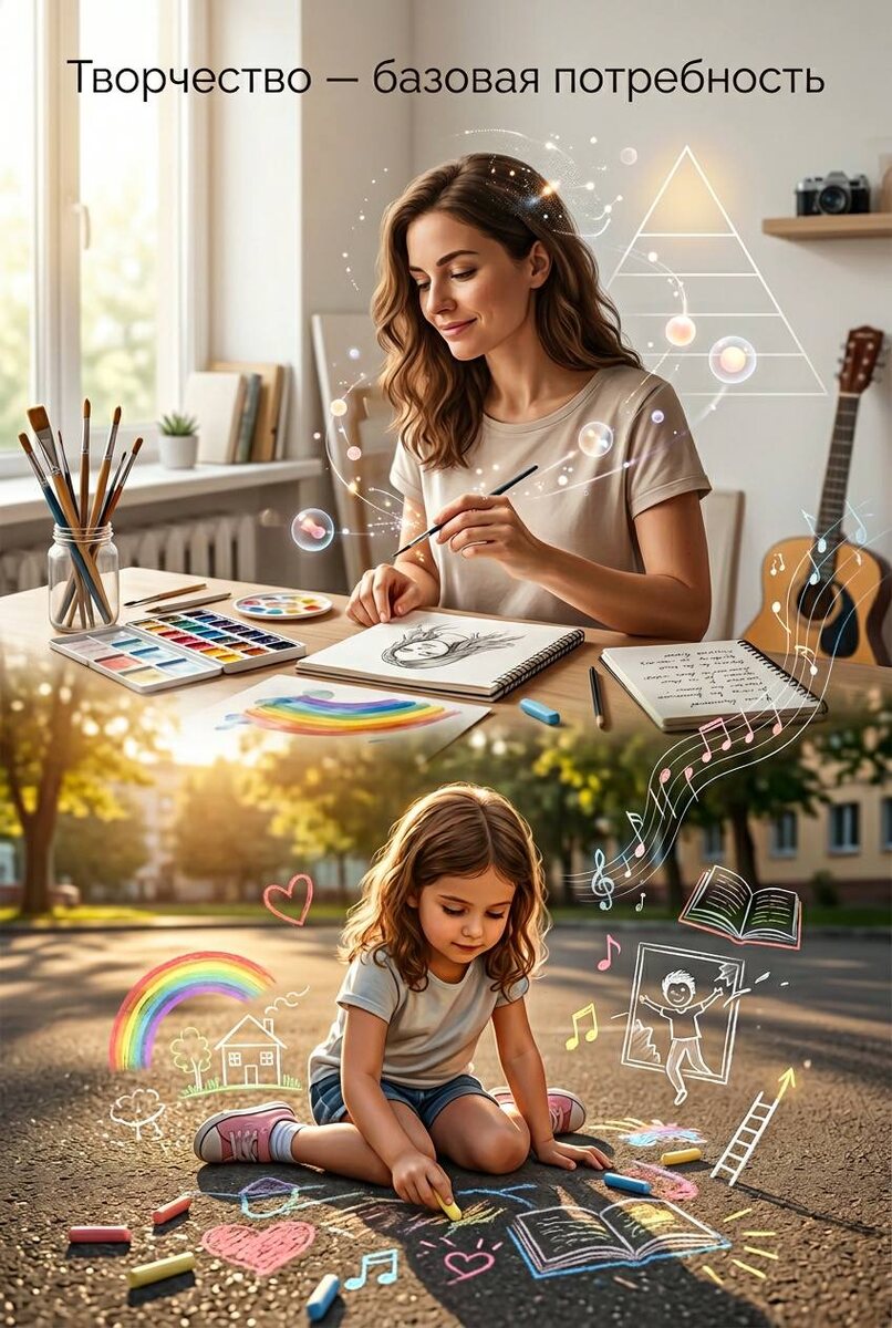 ? 🎨🧠 Помните, как в детстве вы могли час рисовать мелками на асфальте, забыв про всё на свете? Это было не просто развлечение. Это был ваш первый опыт самореализации через творчество — высшей формы человеческой деятельности, где вы просто были собой. Что говорит наука? 🔬 В иерархии потребностей Абрахама Маслоу творчество (самоактуализация) находится на самой вершине — выше безопасности, любви и уважения . Это не «когда есть время». Это то, ради чего мы живём. И вот что удивительно: когда мы творим, в нашем мозге происходят реальные биохимические чудеса: · Дофамин — гормон награды — заливает нас чувством «я могу, я делаю, я живу». · Эндорфины снижают тревогу и дарят то самое «состояние потока», когда время останавливается. · Окситоцин — гормон связи — укрепляет наше чувство принадлежности миру . «Самореализация — это не конечное состояние совершенства. У каждого человека всегда остаются таланты для дальнейшего развития», — писал Маслоу . А вот что говорил великий философ и кул