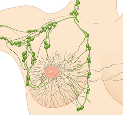 Внеорганная система образована отводящими лимфатическими сосудами и регионарными лимфоузлами, к которым относят подмышечные, подключичные, надключичные, субмаммарные и парастернальные лимфоузлы.