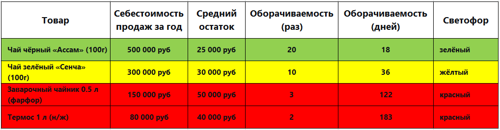 - Зелёный — оборачиваемость выше целевого значения (ваша норма).