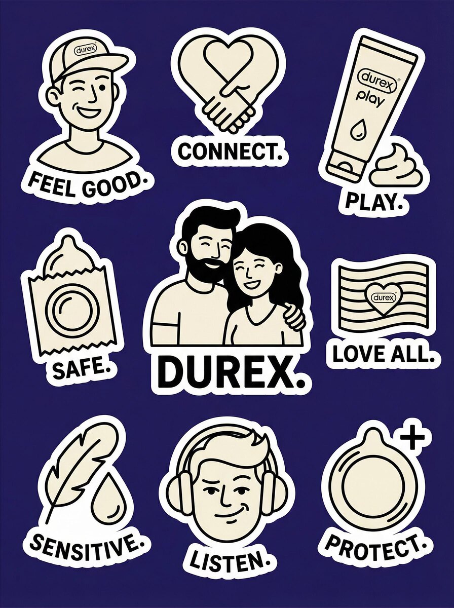 [DUREX]. Выступаю в роли векторного иллюстратора, создающего модный набор высококачественных наклеек. ЗАДАЧА: Преобразуйте фирменный стиль [DUREX] в игривый, целостный набор из примерно 8-10 уникальных дизайнов наклеек, размещенных на одном листе. Создание контента: Не просто создавайте логотипы. Самостоятельно придумайте сочетание: Талисманы/персонажи: Стилизованные бюсты людей, носящих аксессуары, соответствующие бренду, или выражающие эмоции. Ключевые продукты: Знаковые предметы, ассоциирующиеся с брендом. Символы/объекты: Абстрактные формы или инструменты, соответствующие стилю жизни бренда. ВИЗУАЛЬНЫЙ СТИЛЬ (МОНОЛИТНЫЙ ВЕКТОР): Художественный стиль должен строго соответствовать "современному модному линейному искусству". Работа с линиями: Для всех внутренних деталей используйте плотную равномерную линейку (монолайн). Линии должны быть плавными, округлыми и уверенными. Раскраска: Наклейки должны быть выполнены однотонными, не совсем белыми или кремовыми, с использованием цвета л