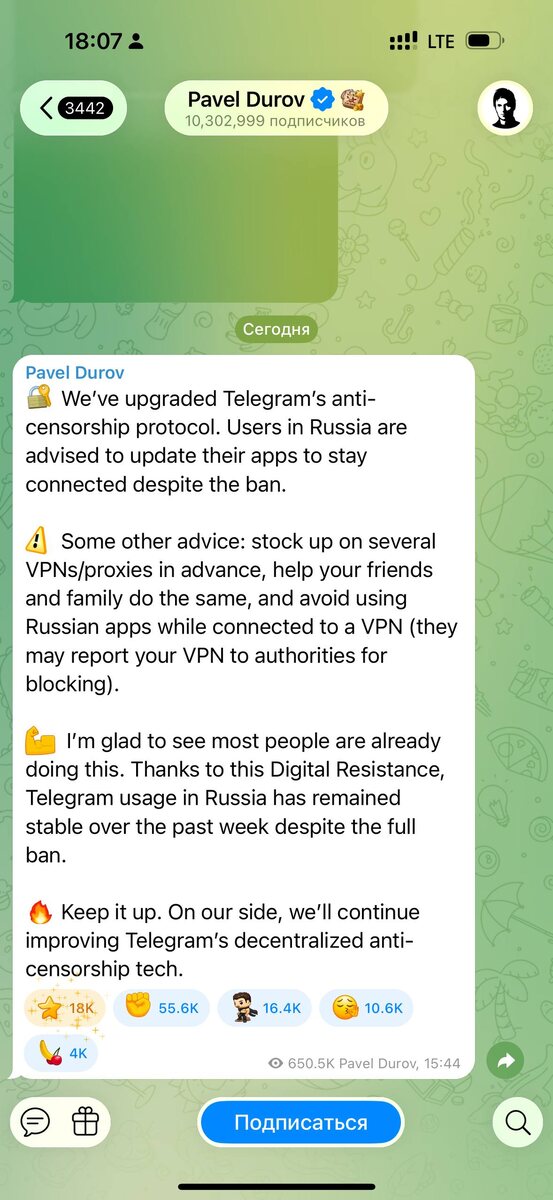 Хоть кто-то что-то делает для нас…🔥 Мы обновили протокол Telegram по противодействию цензуре. Пользователям в России рекомендуется обновить свои приложения, чтобы оставаться на связи, несмотря на запрет. ⚠️ Некоторые другие советы: заранее запаситесь несколькими VPN/прокси, помогите своим друзьям и родственникам сделать то же самое и избегайте использования российских приложений при подключении к VPN (они могут сообщить о вашем VPN властям для блокировки). 💪 Я рад видеть, что большинство людей уже делают это. Благодаря этому цифровому сопротивлению, использование Telegram в России оставалось стабильным на протяжении последней недели, несмотря на полный запрет. 🔥 Продолжайте в том же духе. Со своей стороны, мы будем продолжать совершенствовать децентрализованную технологию противодействия цензуре в Telegram.