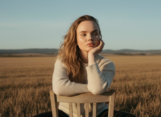 СТРОГО сохранить внешность 1:1 — лицо, черты, пропорции, текстуру кожи, длину и цвет волос. Формат 3:4. Фотореалистичное фото на природе. Камера: 35mm film look, объектив 50mm, f/2.0, ISO 200, 1/500, лёгкий софт-фокус. Средний план, камера на уровне груди. Локация: сухое поле, дальние холмы, открытое небо. Поза: девушка сидит на деревянном стуле; корпус ровно к камере, правая рука поддерживает щеку, локти на спинке стула; левая рука свободно лежит на стуле. Голова слегка наклонена вправо, нежный взгляд направлен вдаль вправо, мимо камеры. Волосы распущенные, волнистые, слегка растрёпаны ветром. Одежда: светлый вязаный свитер. СВЕТ: golden hour, тёплый направленный свет слева, мягкие длинные тени. Плёночное зерно, лёгкая виньетка, приглушённые цвета, винтаж. Без рамок.