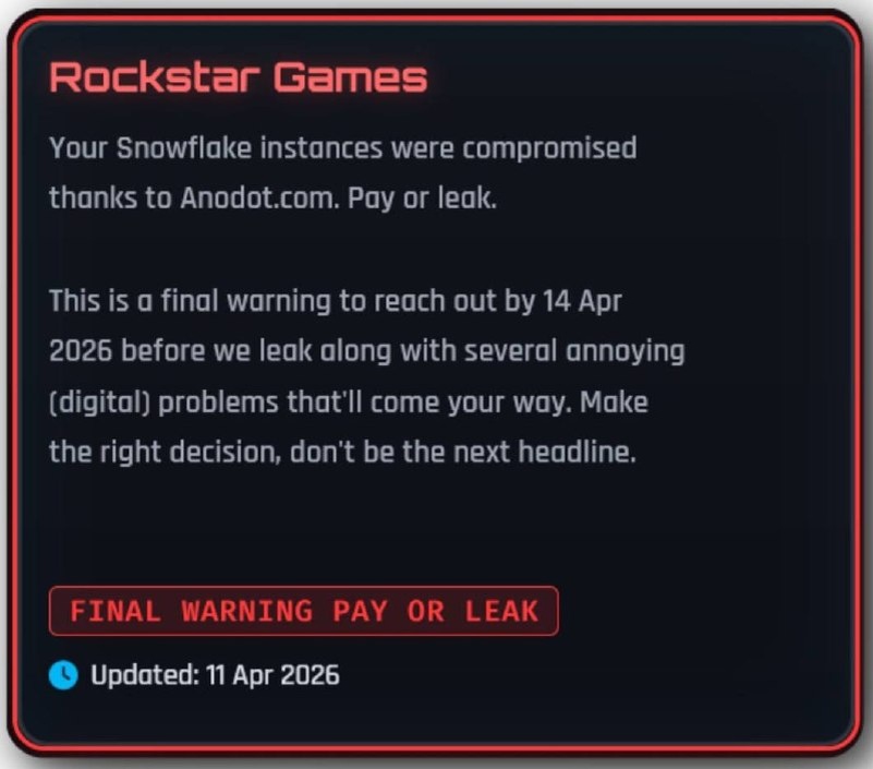 Группировка ShinyHunters заявила о компрометации инфраструктуры Rockstar Games