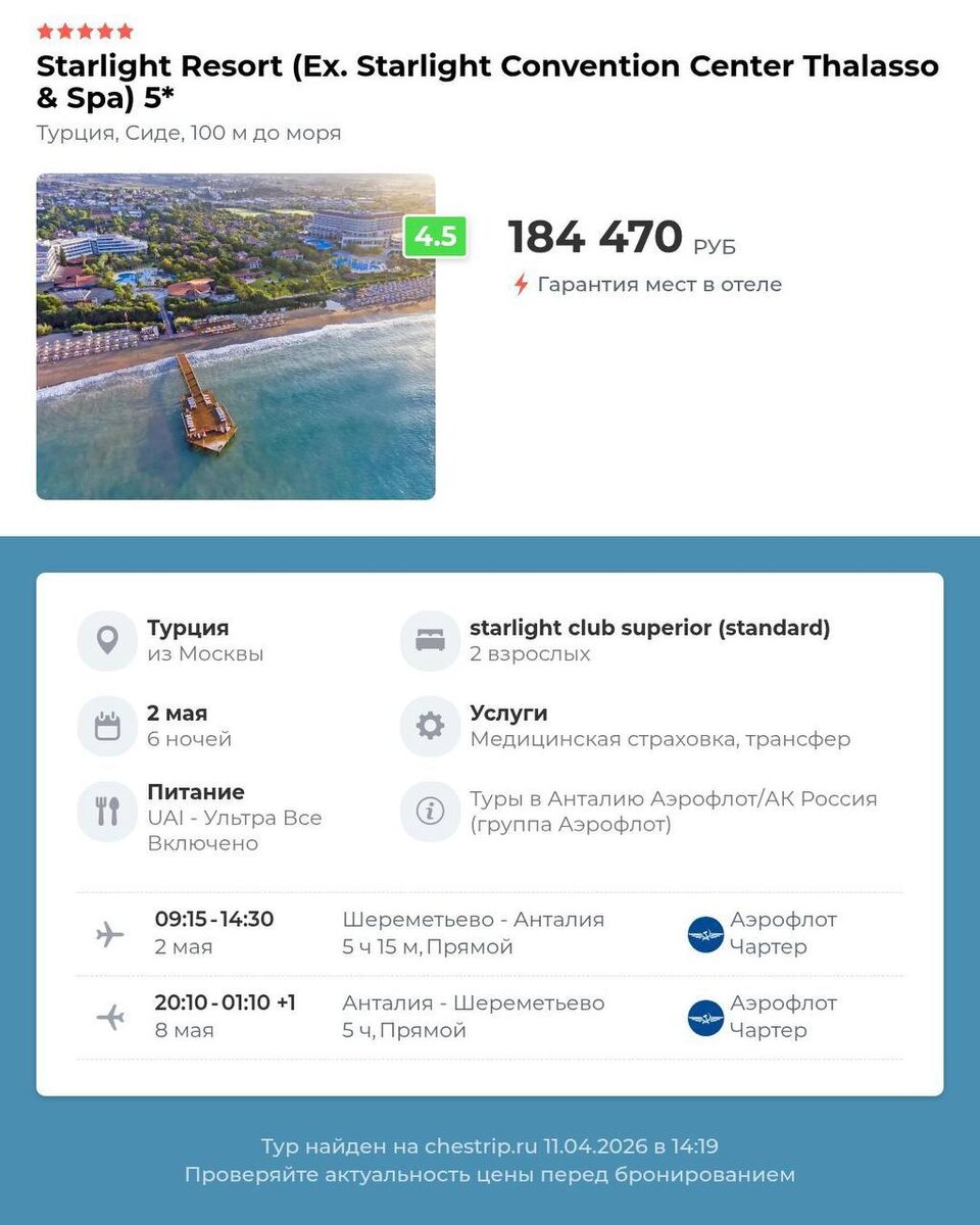 🗓️ 🏠 STARLIGHT RESORT (EX. STARLIGHT CONVENTION CENTER THALASSO & SPA) 5⭐️ ✈️ Москва ➡️ Турция, Сиде ✈️ 2 мая, 09:15 - 14:30, Аэрофлот ✈️ 8 мая, 20:10 - 01:10 +1, Аэрофлот 📅 2 мая, 🌙 6нч 🛌 starlight club superior (standard), 2взр 🍽 Ультра Все Вкл 🏷️ 184 470 руб 🏠 SWANDOR HOTELS & RESORTS TOPKAPI PALACE (EX. WOW TOPKAPI PALACE) 5⭐️ ✈️ Москва ➡️ Турция, Анталья ✈️ 2 мая, 01:10 - 05:25, Southwind ✈️ 8 мая, 20:30 - 01:10, Turkish Airlines 📅 2 мая, 🌙 6нч 🛌 номер делюкс, 2взр 🍽 Ультра Все Вкл 🏷️ 195 037 руб 🏠 IC HOTELS GREEN PALACE & VILLAS 5⭐️ ✈️ Москва ➡️ Турция, Анталья ✈️ 2 мая, 09:15 - 14:30, Аэрофлот ✈️ 8 мая, 20:10 - 01:10 +1, Аэрофлот 📅 2 мая, 🌙 6нч 🛌 standard room, 2взр 🍽 Ультра Все Вкл 🏷️ 215 306 руб 🏠 ADAM & EVE HOTEL ADULTS ONLY 16+ 5⭐️ ✈️ Москва ➡️ Турция, Белек ✈️ 2 мая, 09:15 - 14:30, Аэрофлот ✈️ 8 мая, 20:10 - 01:10 +1, Аэрофлот 📅 2 мая, 🌙 6нч 🛌 design room, 2взр 🍽 Ультра Все Вкл 🏷️ 238 456 руб 🏠 NIRVANA COSMOPOLITAN 5⭐️ ✈️ Москва ➡️ Турция, Ан