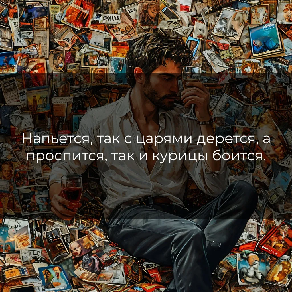 🔥 Смысл и толкование Вдохновлённый хмельными парами, человек чувствует себя великим и непобедимым. Ему море по колено, он готов спорить, драться, идти против кого угодно. Но утро приходит с похмельем, и вот уже герой вчерашних подвигов дрожит перед малейшей неприятностью. Это о ложной храбрости, которая исчезает вместе с парами алкоголя. 📜 Исторический контекст В старину любили говорить, что вино развязывает язык и уносит страх, но только на время. Многие беды начинались с чрезмерного веселья, а поутру приходилось расплачиваться – за слова, за поступки, за разбитую посуду. Эта пословица – напоминание о том, что храбрость должна идти от сердца, а не от кружки. 🏡 Пример из жизни Коля на вечеринке хвастался, что он самый смелый, сильный и ничего не боится. Громко рассуждал о жизни, учил других, как быть храбрым. Но утром, когда нужно было ответить за свои слова перед начальством, он едва выдавил из себя пару слов и старался спрятаться в углу. Вот так и бывает: ночью – герой, днём – тен