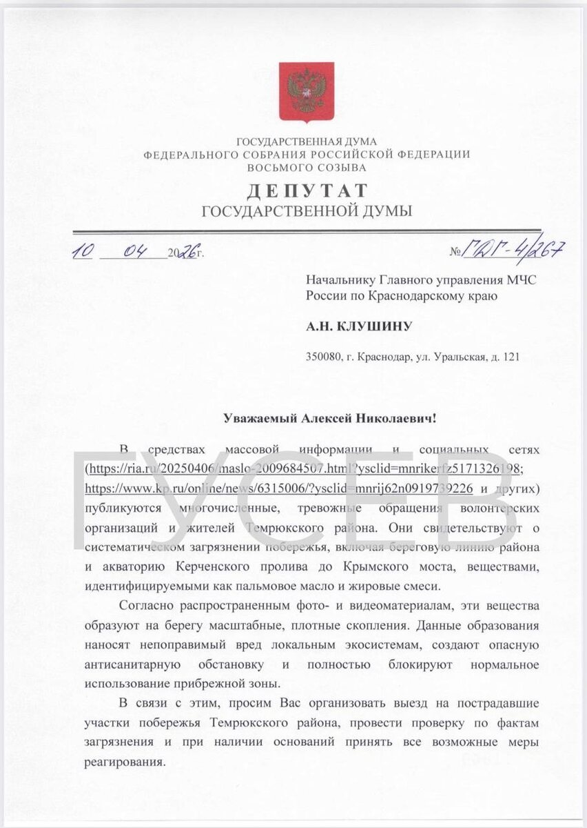 Вместе с Денисом Хмелевским обратились в Азово-Черноморскую природоохранную прокуратуру и ГУ МЧС по Краснодарскому краю с просьбой проверить ситуацию с загрязнением побережья Темрюкского района. По имеющейся информации, на берегу и в акватории Керченского пролива фиксируются скопления веществ, похожих на пальмовое масло и жировые смеси. Люди присылают фото и видео — видно, что это наносит вред экологии, создаёт антисанитарию и мешает нормальному использованию побережья. Попросили: — прокуратуру провести проверку и дать правовую оценку ситуации — МЧС — выехать на место и принять необходимые меры Такие вещи нельзя оставлять без реакции. Важно разобраться, установить источник загрязнения и оперативно навести порядок. Подписывайтесь на мой канал в 📲MAX 📲