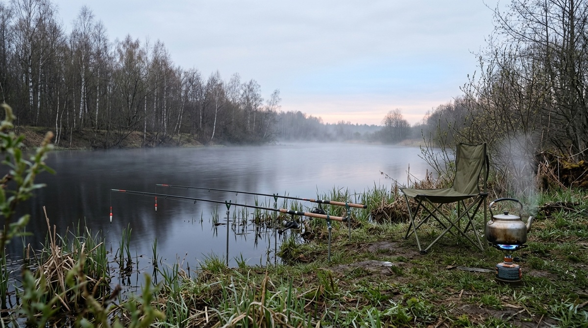 Пруд за деревней, старый карьер, вода держалась на шести с половиной градусах, воздух чуть теплее. Апрель, рассвет, ветер с левого берега.