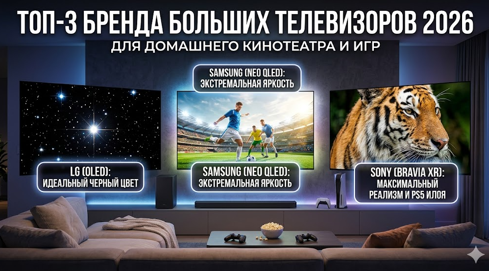 В этом рейтинге мы собрали Топ-3 премиальных бренда, которые делают лучшие телевизоры с большим экраном в 2026 году. У каждого из них есть своя «суперсила».