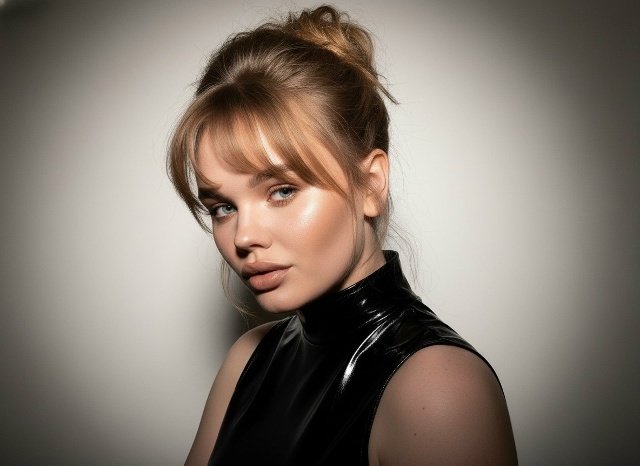 Use the face from the reference photo and preserve facial features and proportions exactly 1:1, do not change the face or hair color. 1990s studio photography aesthetic. Location: minimalist studio with a light neutral background. Model: the same girl from the reference photo, appearance unchanged. Outfit: glossy patent high-neck sleeveless top, shoulders and arms exposed. Hair styled in a 90s bombshell messy updo with strong root volume and curtain bangs. Makeup: matte sculpted contouring, lips defined with lip liner, very high facial detail with visible pores and natural skin texture. Frame: close-up positioned toward the lower-right of the composition, head tilted toward the shoulder, playful seductive gaze from under the brows toward the camera, sharp focus on eyes and lips. Lighting: direct on-camera flash in a dark studio, the light background illuminated while the surrounding space remains dark. Shot on Canon G7X Mark III with flash. Color photo, no filters, raw texture. Vertical format