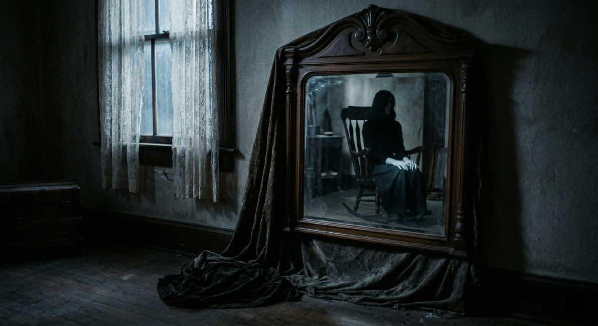 Днём — ничего особенного. Просто зеркало, мутноватое по краям, с мелкими чёрными точками старения амальгамы. Но после того, как на улице темнело, бабушка доставала из комода три куска плотной тёмной ткани и аккуратно завешивала каждое зеркало. Всегда в одном и том же порядке: сначала прихожую, потом спальню, потом зал. И никогда — до заката. Только когда за окном становилось совсем черно.