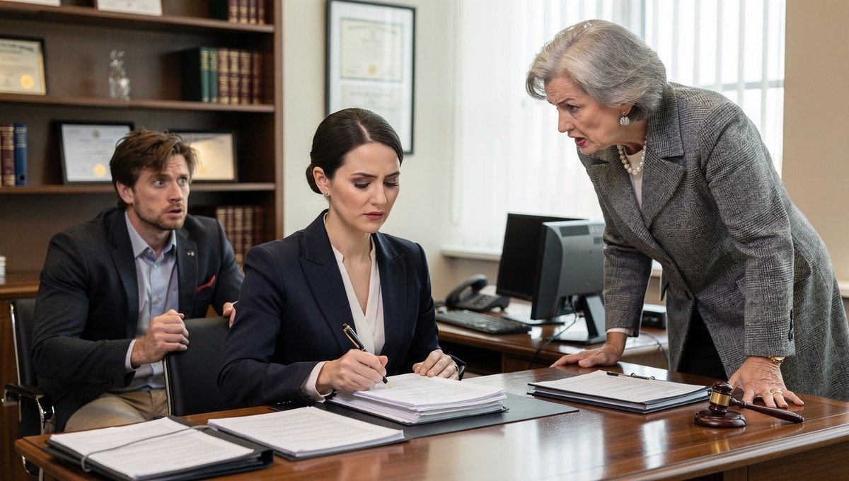 Нотариальная контора располагалась на третьем этаже старого здания в центре города. Людмила приехала первой. Через десять минут появился Андрей — нервный, суетливый, постоянно поправляющий галстук. Ещё через пять минут в дверях возникла Тамара Фёдоровна.