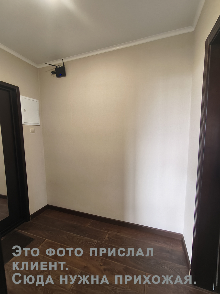Но сначала нужно сделать так, как хочет клиент, а потом уже предлагать менять. Вот что у меня вышло. Затем я подумал - нужно будет в ответном письме клиенту предложить что-то другое. Зашел во вражескую нейросеть, составил промт того что хочу увидеть. Загрузил фото прихожей, вражина выдала мне следующее. Прикрепил это картинки к своим чертежам, написал что - можно в принципе вот так сделать. Вангую, что клиент так не захочет. Ну обычно те, кто со своими схемами приходят, на отрез отказываются радикально что-то менять.