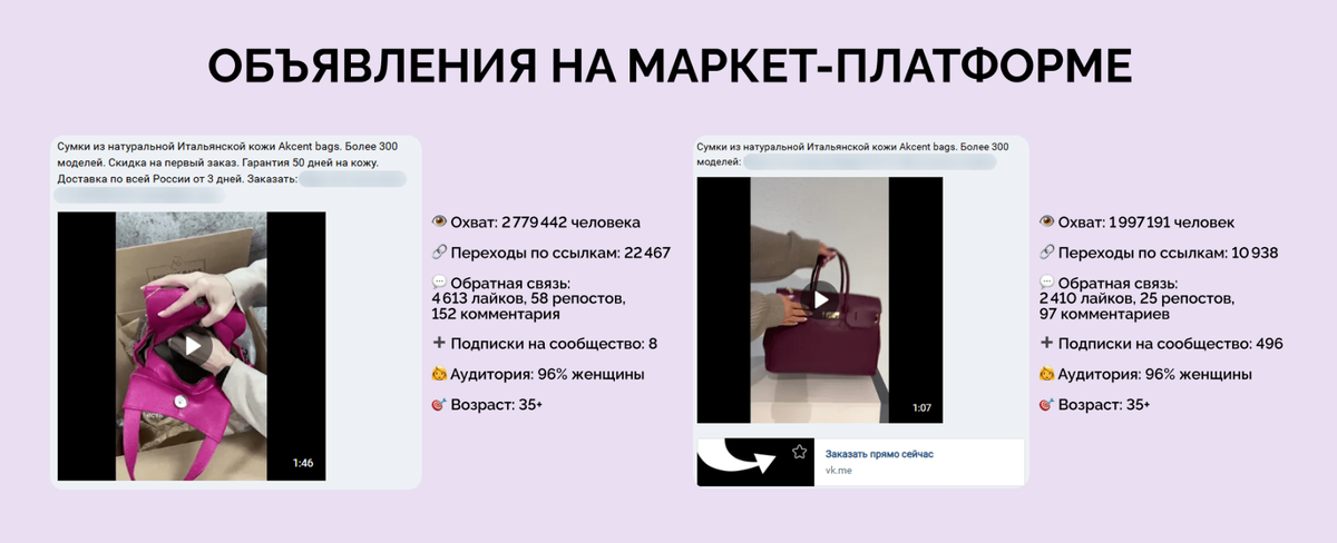 👉 Маркет-платформу VK Это формат, где реклама выходит в чужих пабликах как нативный пост. Задача теста: