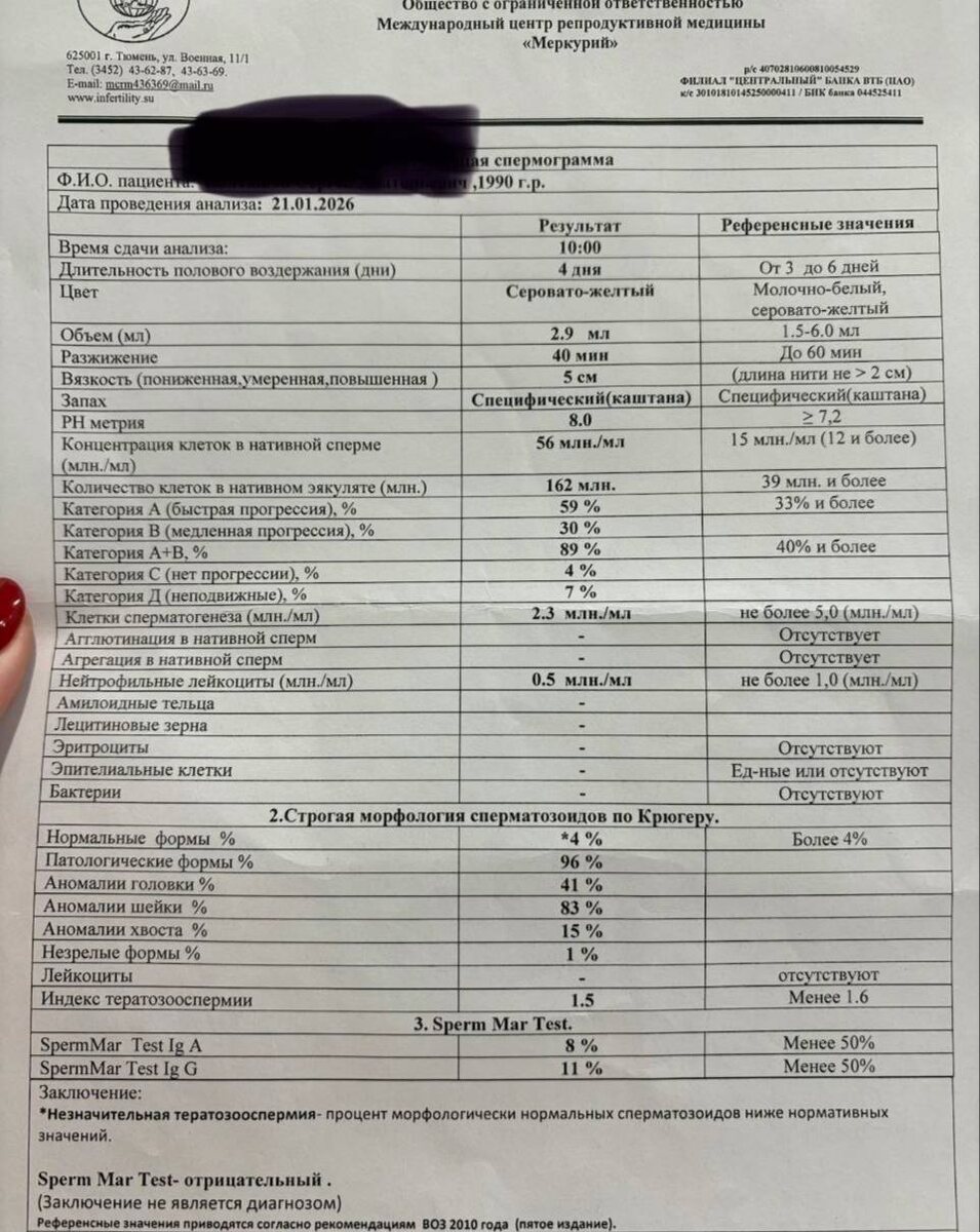 Уже 5 лет не могу забеременеть🥺. Две неудачные попытки эко 😢 На первый взгляд здесь нормозооспермия. Однако есть повышенная вязкость, что может негативно влиять на спонтанное зачатие. Обращает на себя внимание *на морфологии: написано 4%, но в примечание написано, что процент нормальных сперматозоидов снижен - можно предположить, что имели в виду референт не 4, а 14%. Две неудачные попытки ЭКО требуют расширенного спермологического обследования. В ситуации нужно разбираться.